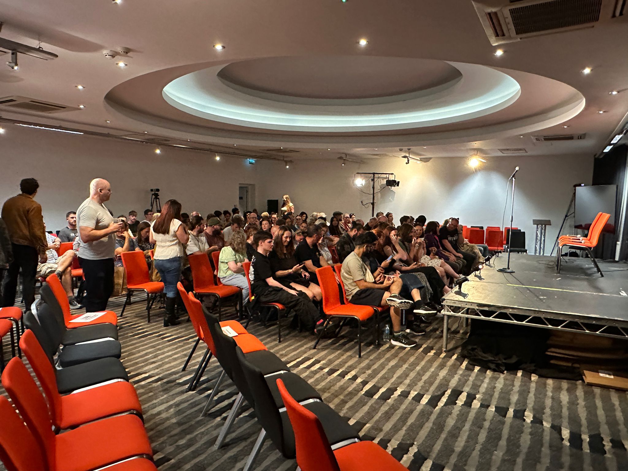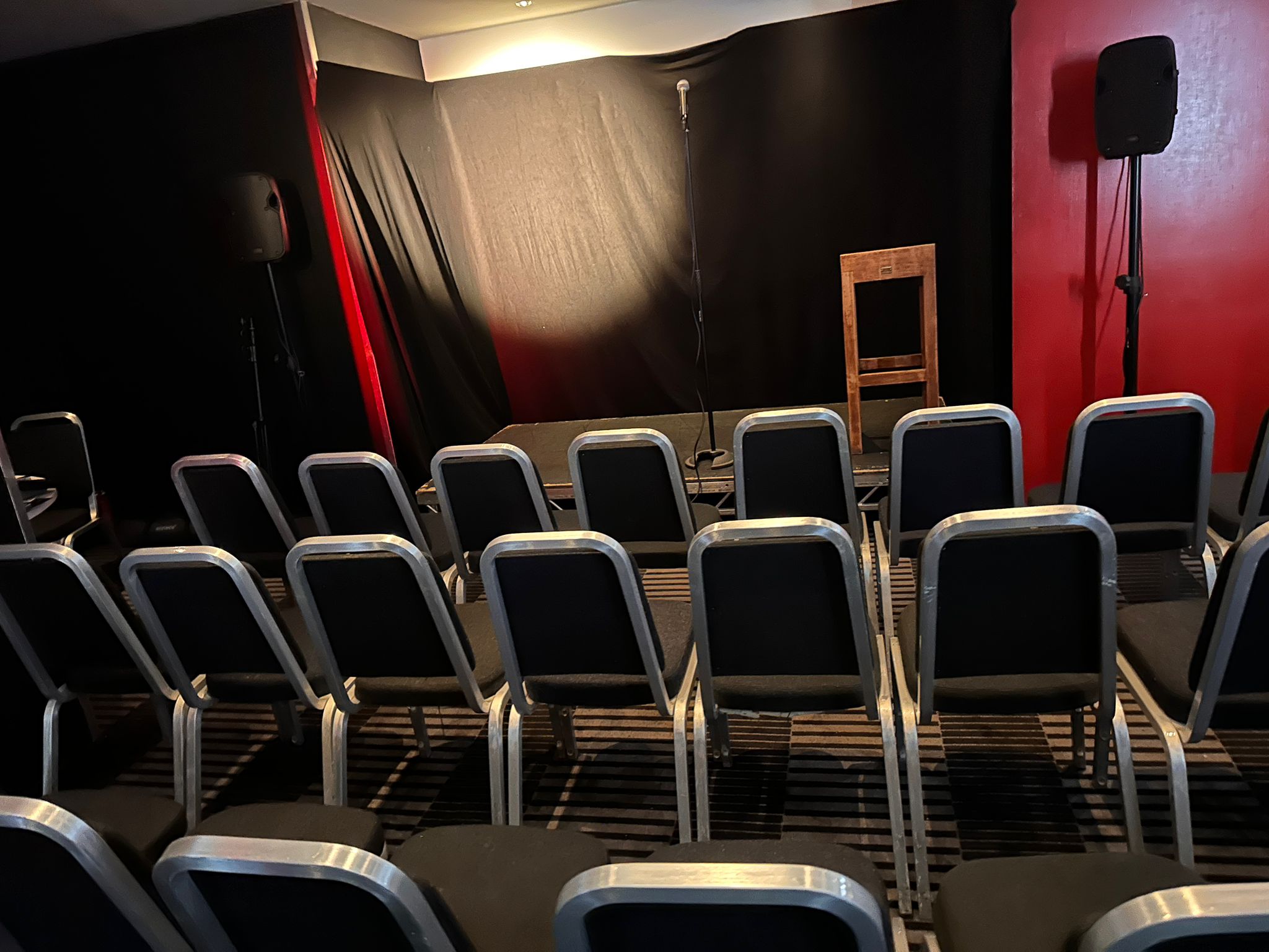 We will provide solid tech; spots,floods, lighting board, sound system , mics, stage. Some rooms have screens and moving heads etc. Chat to us about your specific needs.